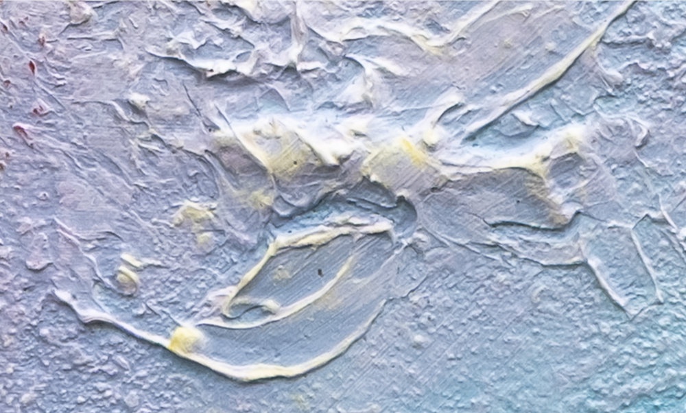 I mixed ultramarine with permanent alizarin crimson to create a rich, deep purplish-blue. Using a large four-inch brush, I roughly blocked in the darker areas where the drama would unfold. Small touches of deep turquoise, more ultramarine, cadmium yellow pale hue, and permanent alizarin crimson were dotted onto the lighter areas before I loaded another four-inch brush with titanium white and swept it across the background, blending those dots of colour into something soft and ethereal.