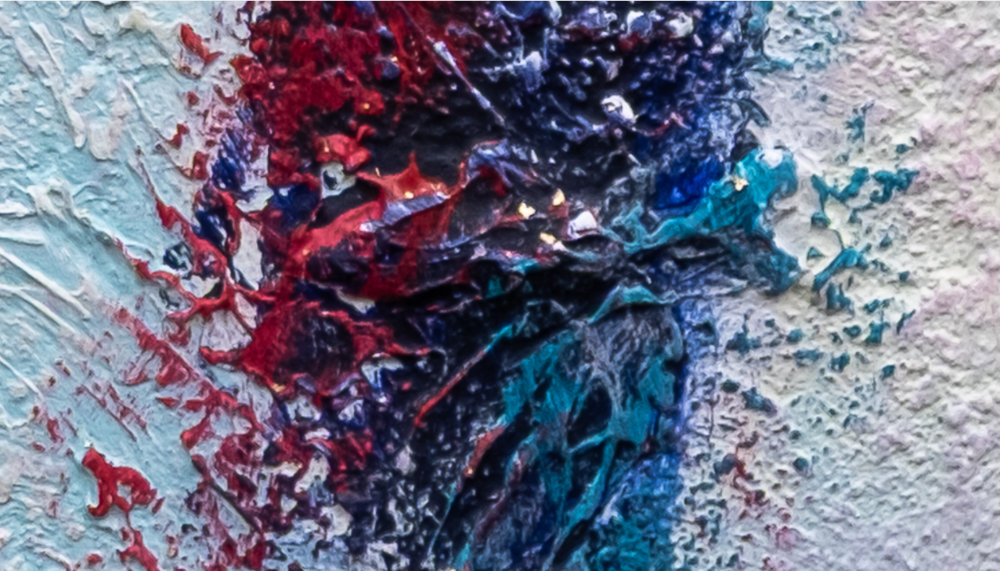 Then came the satisfying work of diving into those darker areas with bolder, stronger colours. I used two-inch brushes and palette knives to build layers, letting the texture guide my hand. The painting was coming together, above, the sky was developing and below, the oceans with four hidden fish. Between them, the violent beauty of sea whipped into the air during a storm.